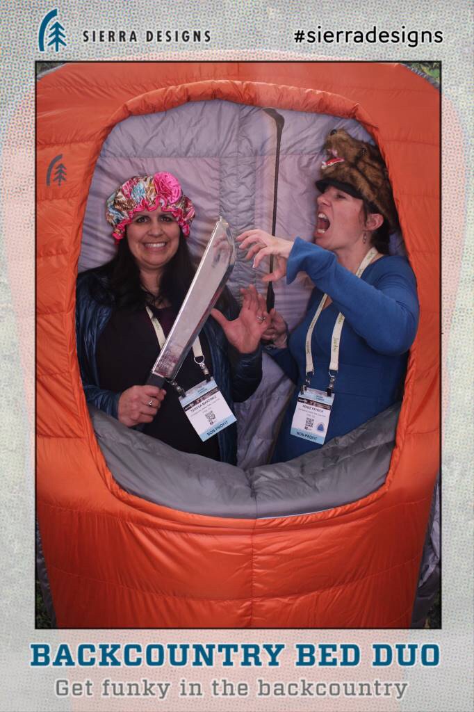 Teresa & I jumped in the giant sleeping bag Sierra Designs had set up.