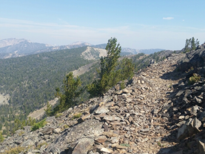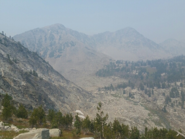 I was in thick smoke again; the rocks and meadows appeared slowly as I moved forward, but once I began a long descent into the forest I couldn’t see the mountains for the trees anyway.